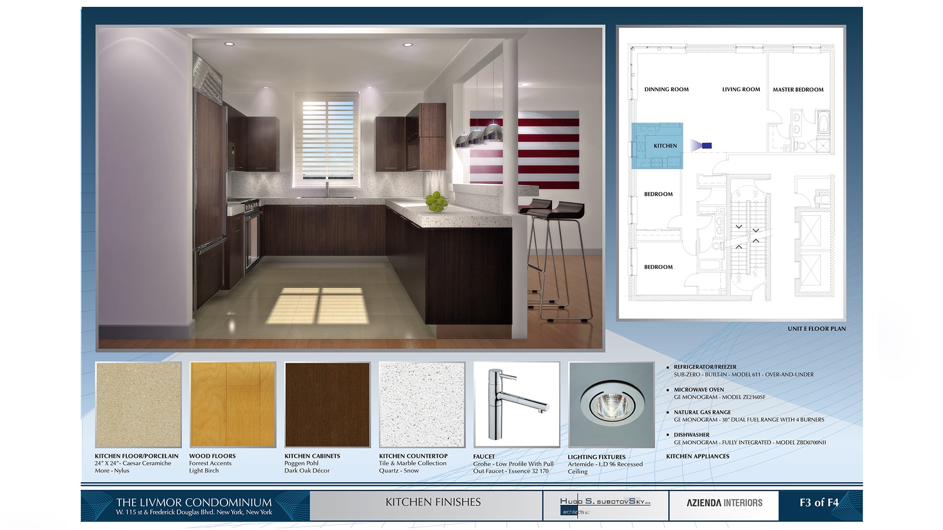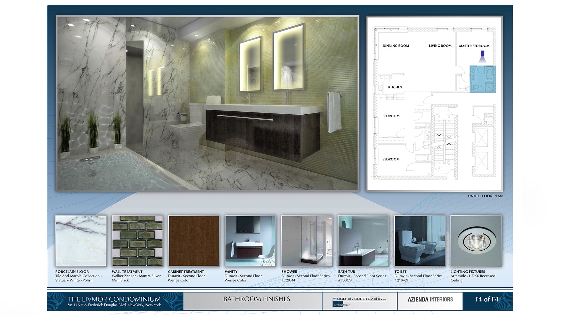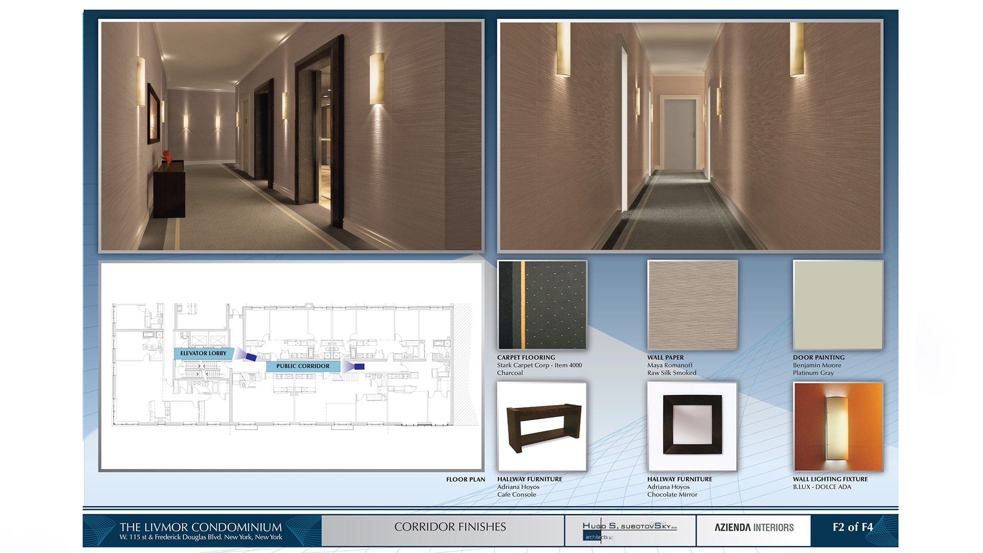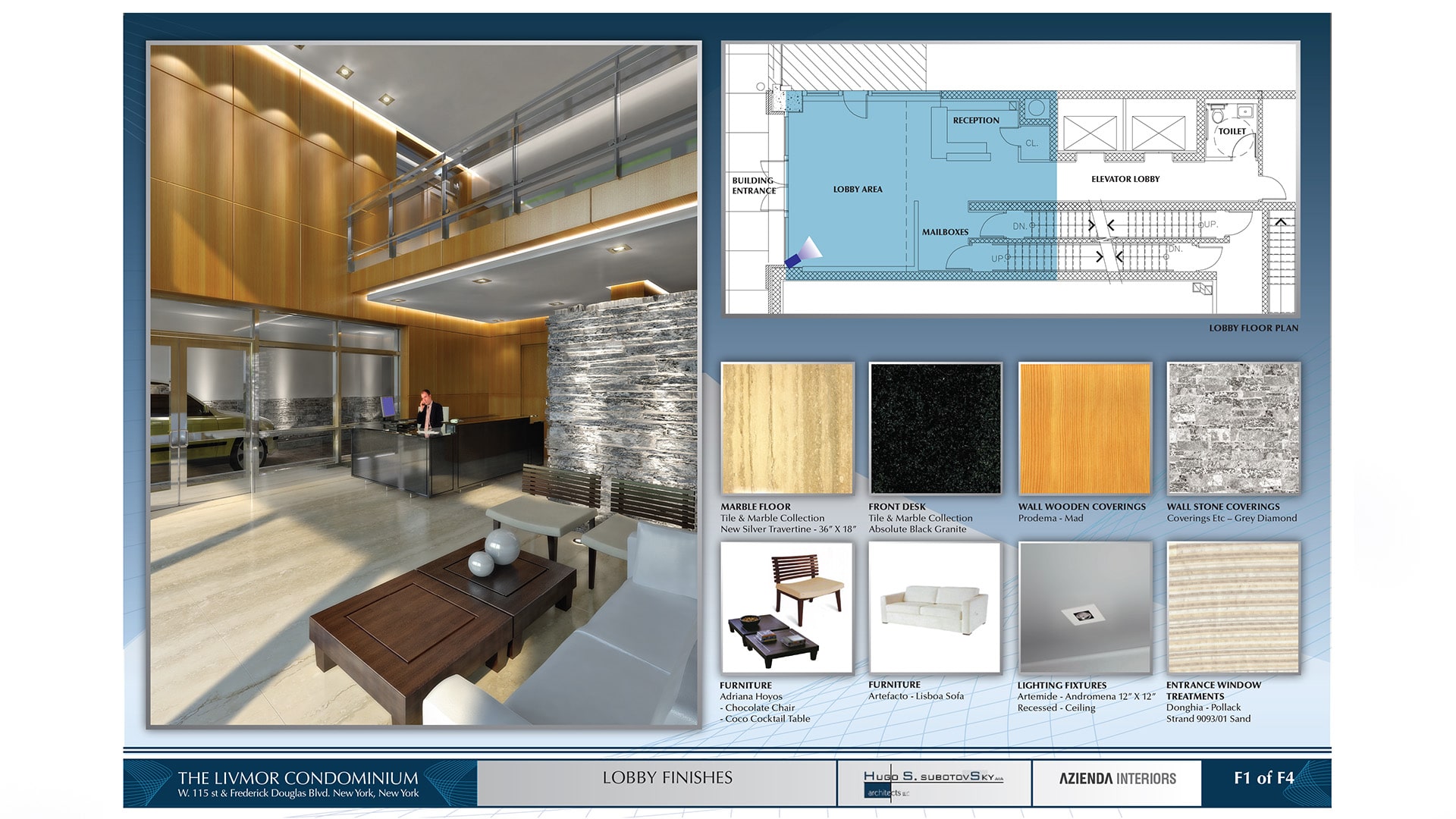 Nuestra agencia trabajo en conjunto con el arquitecto, la empresa de diseño de interiores para producir renders 3D y presentaciones de diseño y decoracion de espacios interiores. Se presentaron 3 paneles con propuestas finales del lobby, cocina y baños.